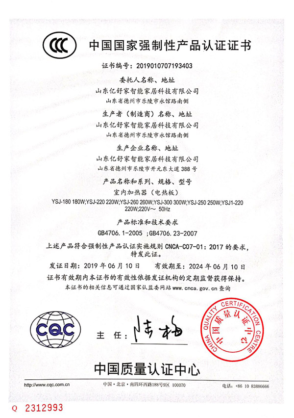室內(nèi)加熱器(電熱板)CCC認證證書